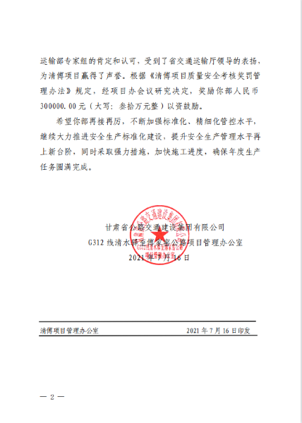 7月20日,因中國二冶集團清傅項目部在交通運輸部平安工地建設專家巡回指導專項行動 2021 年西部片區“三送行動”活動中和省交通運輸廳 2021 年上半年全省公路工程建設項目綜合督查和設計變更專項督查中表現突出,獲得清傅項目辦獎勵人民幣30萬元。