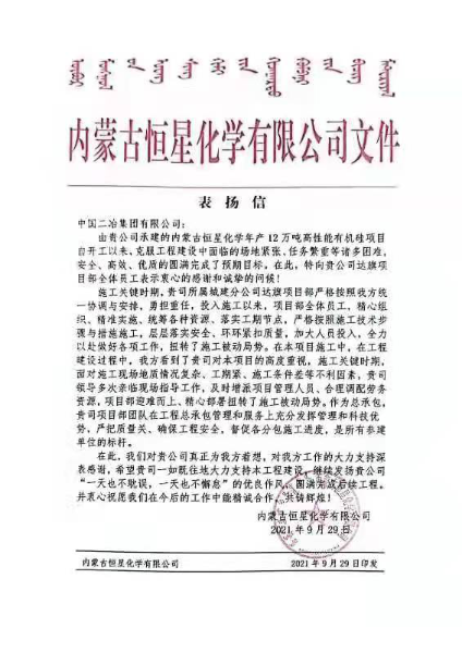 內蒙古恒星化學有限公司向中國二冶集團致表揚信
