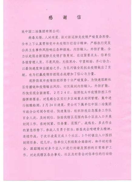 3月2日,昆河鎮人民政府向中國二冶發來感謝信,對中國二冶在全市全力阻擊新冠肺炎疫情擴散蔓延的緊要關頭,不畏風險,無懼寒冷,守望相助,齊心協力,以最快速度為昆河鎮快速阻斷社區傳播鏈和疫情輸出風險所做出的貢獻,對央企快速反應、雷厲風行的工作作風表示感謝。