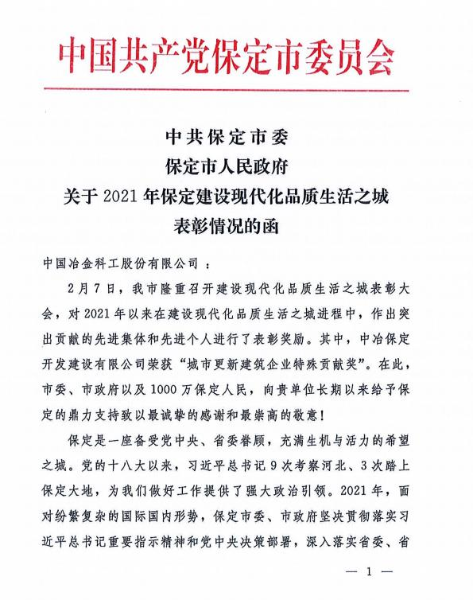 2月7日,保定市隆重召開建設現代化品質生活之城表彰大會,會上對2021年以來在建設現代化品質生活之城進程中,作出突出貢獻的先進集體和先進個人進行了表彰獎勵。其中,中冶集團中冶保定開發建設有限公司榮獲“城市更新建筑企業特殊貢獻獎”。表彰函中寫到,2022年,是保定市建設現代化品質生活之城的關鍵一年,保定市委、市政府期望中冶集團持續關注關心保定市的經濟社會發展,保定市委、市政府也將與中冶集團攜手共享新機遇、共謀新發展、共贏新未來。