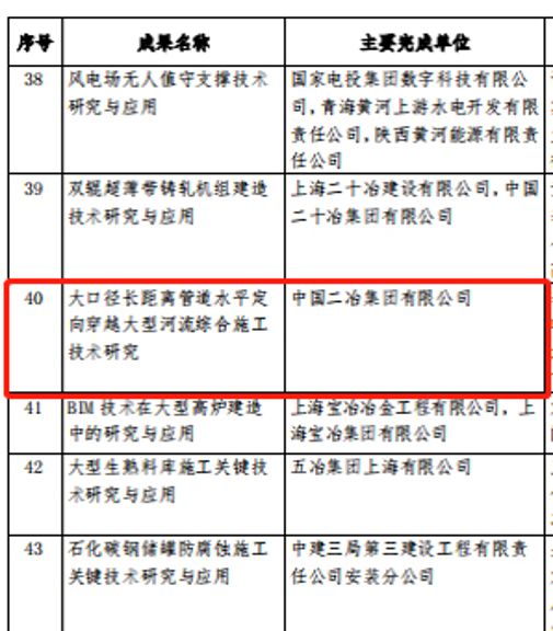 4月12日,中國安裝協(xié)會公布《關于公布2022年中國安裝協(xié)會科學技術進步獎評選結果的通知》的正式文件。中國二冶申報的《大口徑長距離管道水平定向穿越大型河流綜合施工技術研究》首次斬獲中國安裝協(xié)會科學進步獎二等獎。