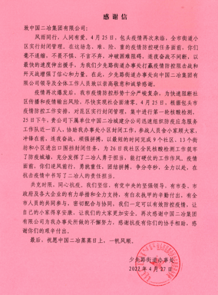4月27日,包頭市昆區少先路街道辦事處致中國二冶感謝信,表揚中國二冶在這場急、難、險、重的疫情防控硬任務面前,毫不退縮,不畏不懼、不言不棄,沖破困難阻礙,連夜奮戰不間斷,以最快的速度伸出援手,近一百名職工沖鋒到社區疫情封控一線,全力配合昆區政府順利完成任務。特向中國二冶干部職工致以崇高敬意和衷心感謝!