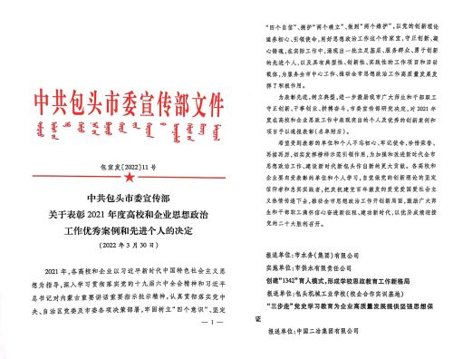 5月12日,中國二冶收到中共包頭市委宣傳部《關(guān)于表彰2021年度高校和企業(yè)思想政治工作優(yōu)秀案例和先進(jìn)個人的決定》通知文件,公司報(bào)送的《“三步走”黨史學(xué)習(xí)教育為企業(yè)高質(zhì)量發(fā)展提供堅(jiān)強(qiáng)思想保證》榮獲“職工思想政治工作優(yōu)秀案例”。