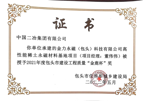 6月1日,中國(guó)二冶收到包頭市建筑業(yè)協(xié)會(huì)頒發(fā)的榮譽(yù)證書,中國(guó)二冶金力永磁 (包頭)科技有限公司高性能稀土永磁材料基地、包頭市監(jiān)委留置場(chǎng)所、校園南路小區(qū)四期B地塊工程(二標(biāo)段)3#、5#住宅樓三項(xiàng)工程喜獲2021年度包頭市“金鹿杯”工程質(zhì)量獎(jiǎng)。