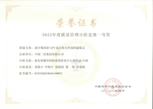 近年來(lái),中國(guó)二冶始終長(zhǎng)期堅(jiān)持走高技術(shù)高質(zhì)量創(chuàng)新發(fā)展之路,自上而下成立質(zhì)量管理QC小組,加大科技創(chuàng)新力度,不斷鼓勵(lì)科研人員廣泛開(kāi)展群眾性QC成果活動(dòng),加強(qiáng)工程實(shí)體質(zhì)量,打造精品工程,取得了突出成績(jī)。其中,中國(guó)二冶城建分公司淮安智慧谷科研成果轉(zhuǎn)化中心項(xiàng)目QC小組編寫(xiě)的《減少現(xiàn)澆梁與PC疊合板交界處的漏漿點(diǎn)》、鋼結(jié)構(gòu)分公司QC小組編寫(xiě)的《提高箱型柱對(duì)接焊縫一次焊接合格率》兩項(xiàng)QC成果榮獲內(nèi)蒙古自治區(qū)2022年度質(zhì)量管理小組競(jìng)賽一等獎(jiǎng)。