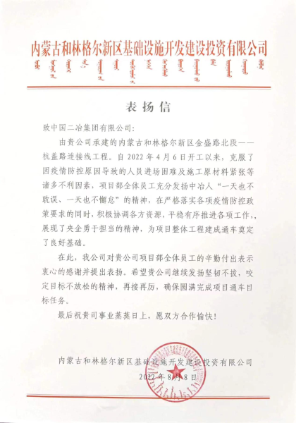 中國二冶收到內蒙古和林格爾新區基礎設施開發建設投資有限公司表揚信