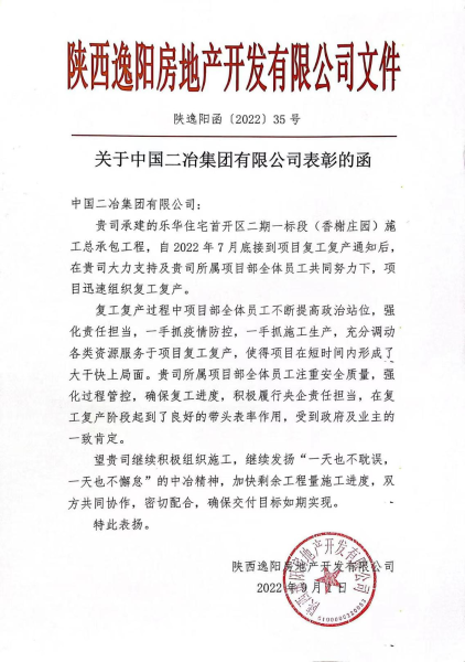 9月1日,中國二冶收到陜西逸陽房地產(chǎn)開發(fā)有限公司發(fā)來的《關(guān)于中國二冶集團(tuán)有限公司表彰的函》。表彰函充分肯定了中國二冶陜西分公司在樂華住宅首開區(qū)二期一標(biāo)段(香榭莊園)施工總承包項目復(fù)工復(fù)產(chǎn)以來展現(xiàn)出來的關(guān)鍵時刻頂?shù)米。щy面前勇攀登的央企風(fēng)范。