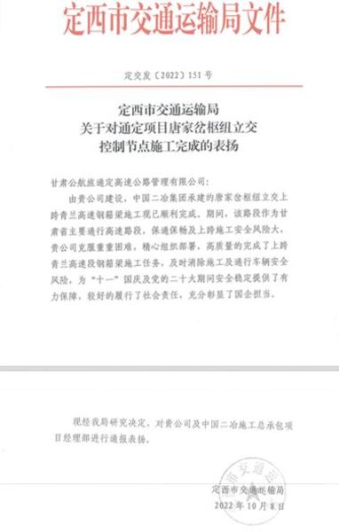 10月21日,中國二冶通定高速項目部收到來自定西市交通運輸局的表揚信,對中國二冶通定高速項目部管理團隊按時完成節點目標表示高度肯定。