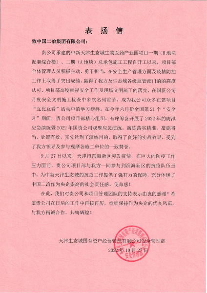 10月27日,天津生態(tài)城國有資產(chǎn)經(jīng)營管理有限公司安全管理部向中國二冶致表揚信,對中國二冶集團(tuán)中新天津生態(tài)城生物醫(yī)藥產(chǎn)業(yè)園項目部自開工以來積極主動、勇于擔(dān)當(dāng)、提前謀劃、精心組織給予表揚,同時對項目部在安全生產(chǎn)管理方面及疫情防控工作上所取得的突出成績表示了高度贊賞。