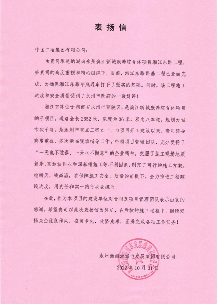 10月31日,中國二冶濱江新城康養(yǎng)綜合體項(xiàng)目收到來自永州瀟湘源城市發(fā)展集團(tuán)有限公司的表揚(yáng)信,對中國二冶濱江新城康養(yǎng)綜合體項(xiàng)目部管理團(tuán)隊(duì)按時(shí)完成湘江東路路基建設(shè)表示高度贊揚(yáng)。