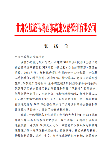 中國二冶收到甘肅公航旅馬塢西寨高速公路管理有限公司表揚信