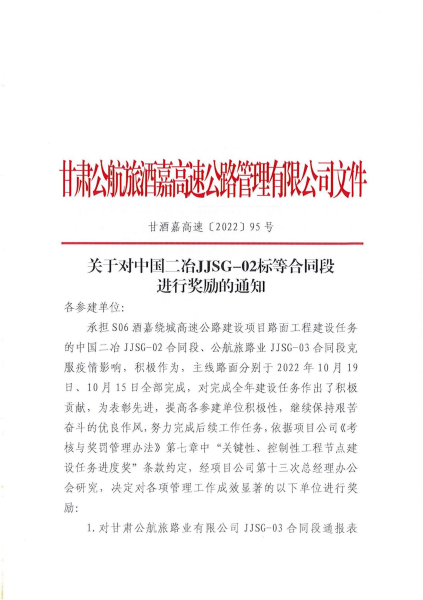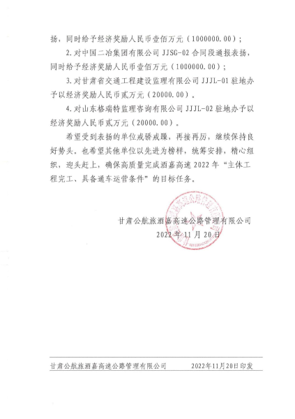 11月23日,甘肅公航旅酒嘉高速公路管理有限公司在酒嘉繞城高速公路項目全線發出通報,對中國二冶酒嘉項目部在關鍵性、控制性工程節點的建設任務完成出色,在工程質量、安全生產等方面的突出表現給予通報表揚,并給予100萬元經濟獎勵。
