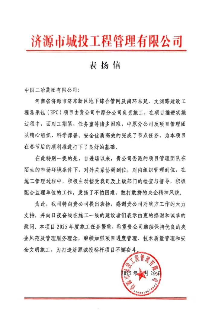 近日,中國(guó)二冶連續(xù)收到由溫縣新興產(chǎn)業(yè)投資集團(tuán)有限公司和濟(jì)源市城投工程管理有限公司發(fā)送的表揚(yáng)信,對(duì)項(xiàng)目管理團(tuán)隊(duì)在建設(shè)過程中的突出表現(xiàn)表示高度贊揚(yáng)。