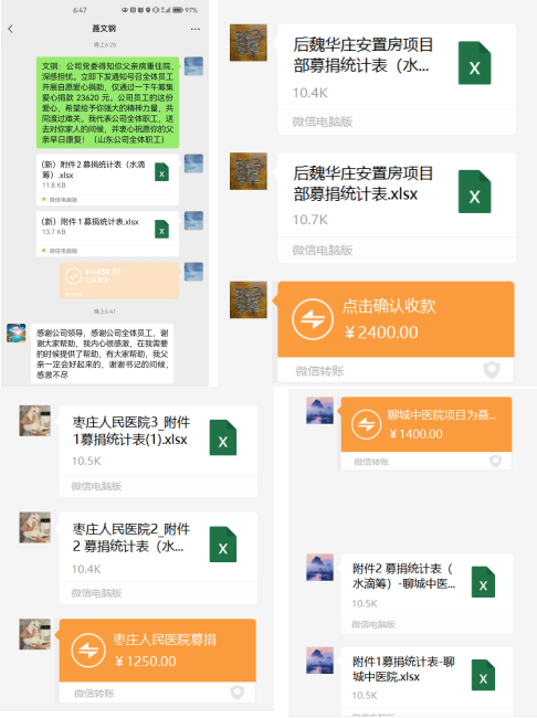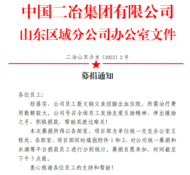 4月21日,在山東分公司工作群中,隨著一份募捐通知的下發(fā),機(jī)關(guān)各部門、各項(xiàng)目部干部員工紛紛行動,為分公司曹縣安置房項(xiàng)目員工聶文鋼的父親進(jìn)行愛心募捐。